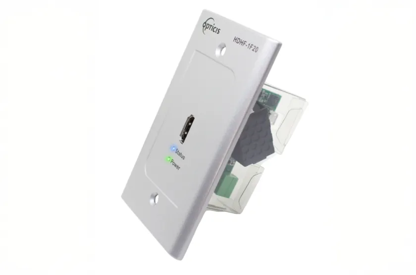 The Opticis HDHF-1F20 is a high-performance HDMI 2.0 fiber optic wall plate extender designed for professional AV and medical installations requiring long-distance, uncompressed 4K video transmission in a clean, integrated wall-mounted form factor.