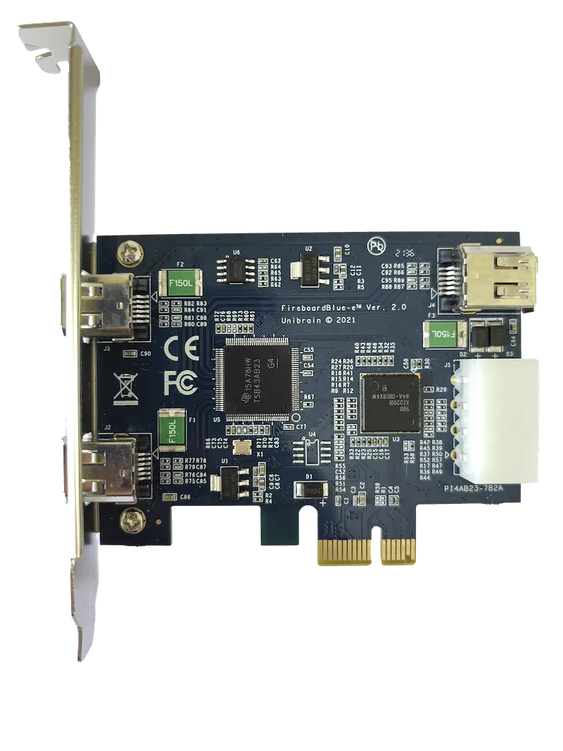 The Unibrain FireboardBlue-e™ is a FireWire 400 (IEEE 1394a) PCI Express host adapter built for professionals who still rely on legacy FireWire devices in machine vision, broadcast, scientific, and industrial environments. It provides fast, reliable FireWire connectivity to modern desktop systems through a single PCIe slot.
